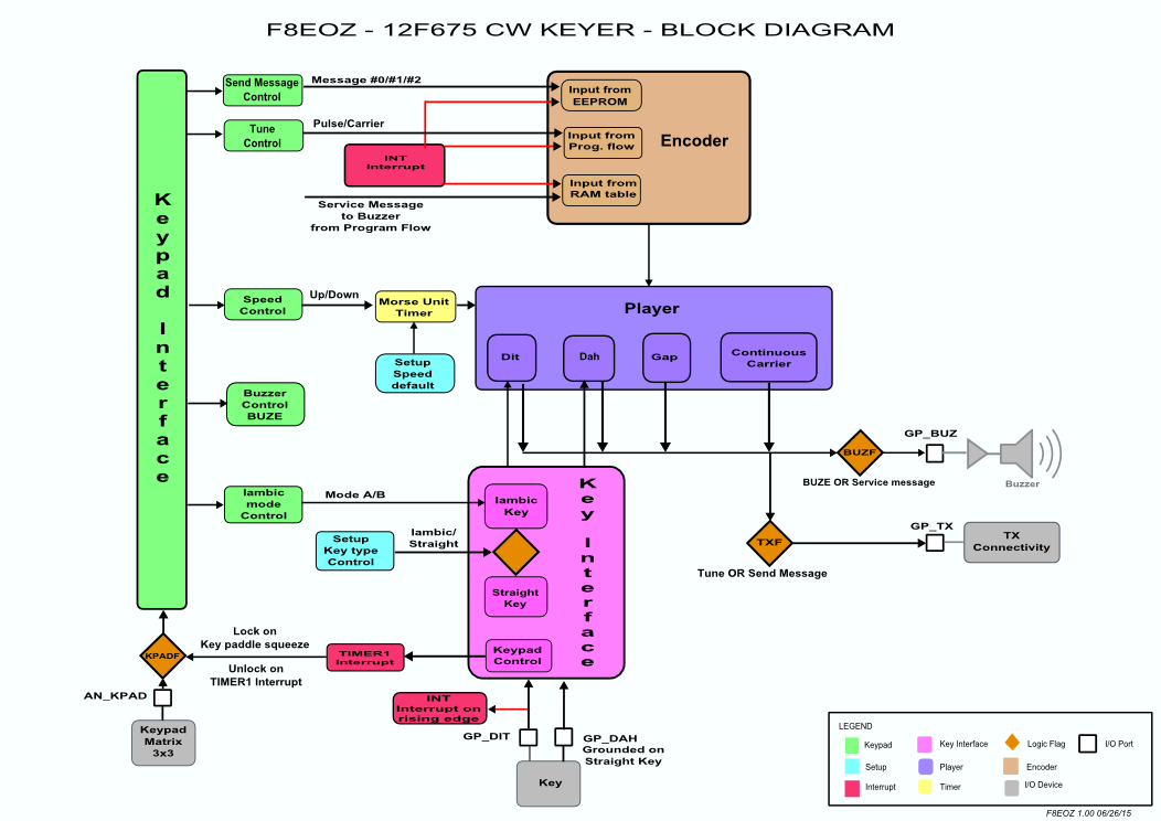 KEY INTERFACE: traduit les appuis de la CLEF en DIT et DAH. Le type de clef Iambique ou Droite est déterminé automatiquement au Setup (DAH à la masse = clef Droite). Le mode Iambique A ou B est sélectionnable par une touche du clavier fonctionnant en bascule. L’interface commande l’accès au clavier blocage/déblocage de manière asynchrone par l’interruption TIMER1.