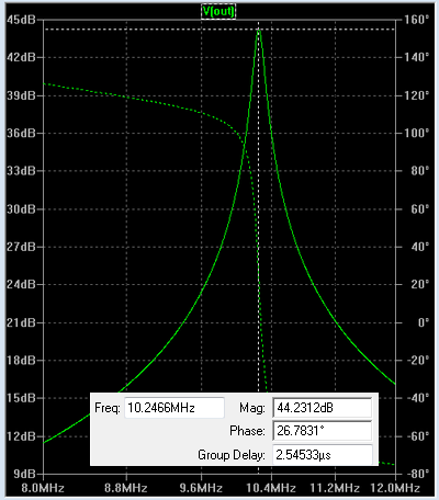 - fréquences de coupure à -3dB, f1 = 10,189 MHz, f2 = 10,315 MHz,