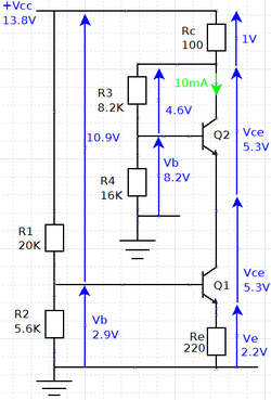 Tension de base: Vb2 = IcRe + Vce1 + Vbe = 10 . 0,220 + 5,3 + 0,7 = 8,2 V