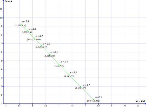 La figure 7 ci-dessous, montre le déplacement du point de repos avec la variation du potentiomètre de gain. La variation du gain ne suit pas linéairement la variation du potentiomètre. Pour m=0.1 le gain en tension G =20 dB, pour m = 0.5 G = 41,5 dB, pour m = 1 G = 44 dB.