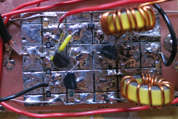 Suivant la méthode modulaire, l’oscillateur et le mélangeur sont montés sur 2 plaques. La photo 1 ci-dessous, montre le circuit de l’oscillateur réalisé sur une plaque d’époxy cuivrée simple face de 24 x 24 mm selon le mode de fabrication décrit dans les articles précédents. Le circuit tracé est un quadrillage: 2 lignes de 8 mm + 2 lignes de 4 mm, 3 colonnes de 8 mm. Nous obtenons ainsi 2×3 = 6 îlots de 8×8 mm. Les 2 lignes de 4 mm, placées de part et d’autre, servent de rail de masse. De même, La photo 2 ci-dessous, montre le circuit du mélangeur réalisé sur une plaque d’époxy cuivrée simple face de 48 x 32 mm. Le circuit tracé est un quadrillage: 3 lignes de 8 mm + 2 lignes de 4 mm, 6 colonnes de 8 mm. Nous obtenons ainsi 3×6 = 18 îlots de 8×8 mm. Les 2 lignes de 4 mm, placées de part et d’autre, servent de rail de masse. L’oscillateur placé à proximité du mélangeur est relié à celui-ci par un simple fil très court. Le mélangeur est relié à la sortie du VFO par un cable coaxial 50Ω RG-174. Attention un seul côté du blindage doit être relié au plan de masse.