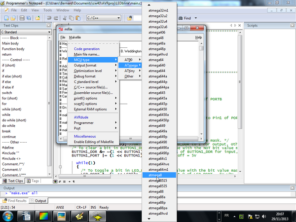 Dans le menu de la fenêtre qui vient de s’ ouvrir, cliquer sur Makefile, puis sur MCU type, puis sur Atmega, et enfin choisir dans la liste atmega8.