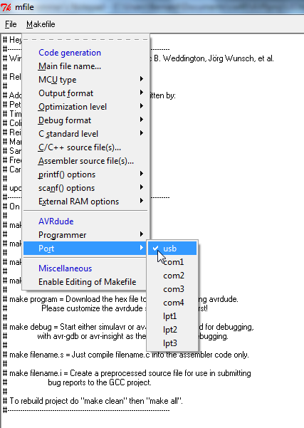 De la même façon, dans le menu cliquer sur Makefile, puis sur Port, et enfin choisir dans la liste usb.