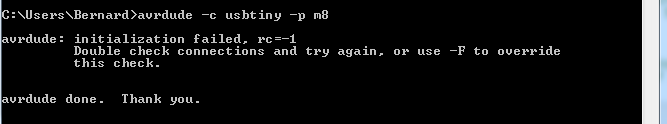 La photo 4 ci-dessous montre le message qu’il faut obtenir. Cela indique que la connexion est bien établie mais que le dispositif, ici m8, pour ATMEGA8 n’est pas connecté. Normal puisqu’ aucun microcontrôleur à programmer n’est connecté à la ligne ISP. Bien entendu si vous compter utiliser un autre microcontrôleur, changer simplement le paramètre de l’option -p. La liste des dispositifs est donnée dans la documentation de avrdude. Mais le message obtenu sera le même.