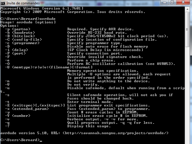 Dans la fenêtre invite de commandes, taper avrdude.