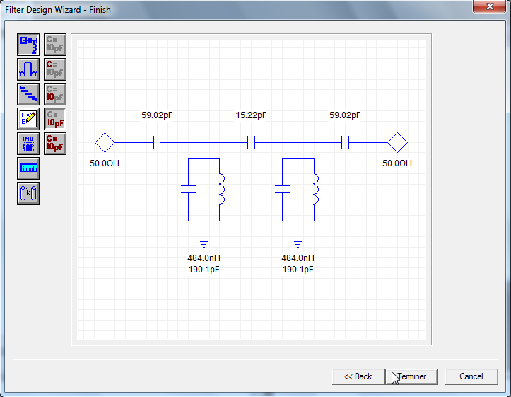 Dans le menu Project, choisir Insert Filter Design. Choisir le type de filtre. J’ai choisi Bandpass, Coupled resonator, Chebyshev, Ideal, Capacitiveliy coupled , figure 5 ci-dessus. Dans la fenêtre suivante figure 6, entrer les paramètres du filtre, l’ordre, la fréquence centrale, la largeur de bande (le logiciel calcule lui-même les fréquences fp1 et fp2), les résistances d’entrée et de sortie, une valeur de L réaliste et compatible avec le tore que vous souhaitez utiliser.