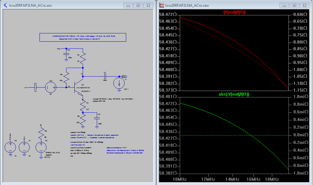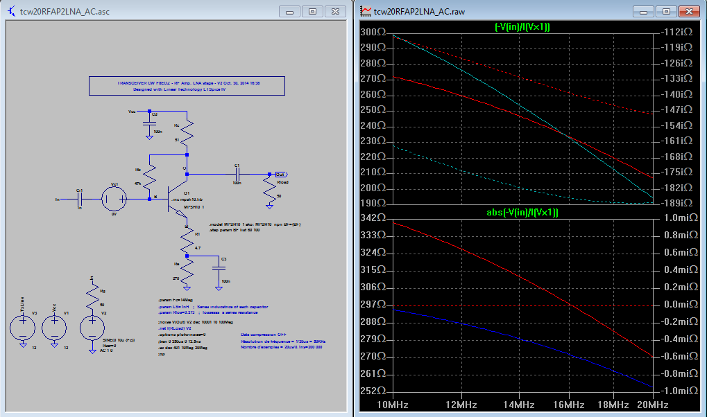 Le filtre passe bande est associé à l’amplificateur. Le graphe du bas, figure 14, montre que le gain S21 se situe autour de 15db@14MHz. L »analyse est faite avec BF=60 et BF=100. On ne constate pratiquement pas de différence. Le graphe du haut montre les facteurs de stabilité (Rollett stability factor). Pour obtenir kfactor et B1 il faut mettre dans le fichier plot.defs, les 2 fonctions ci-dessous. Pour ce faire, dans la fenêtre active de LTSPICE, placer vous sur le graphe obtenu (fichier raw), dans le menu Plot Settings, choisir Edit Plot Defs File, copier, coller les formules, fermer la fenêtre, quitter LTSPICE pour que les nouvelles fonctions soient prises en compte.