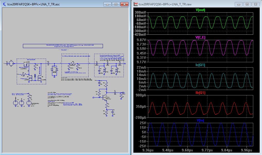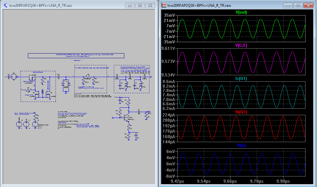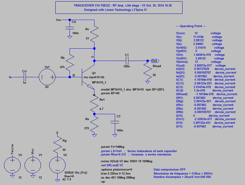 Le circuit complet du module RF, figure 14, est présenté en mode réception. Le générateur en entrée produit une tension crête de 10mV @50Ω, figurant ainsi un signal de 1uW @14MHz soit -30dBm sur l’antenne. En radio, sur 50 Ohms, dBm = 10*log(P) avec P en milliwatt. Où P = 0.010V*0.010V*1000/(2*50Ω), il vient 10*log(0.001)=-30dBm. Cela peut être calculé simplement avec mini dB calculator de DL5SWB (silent key). En sortie nous obtenons un signal de 25mV crête @50Ω soit 6.3uW.