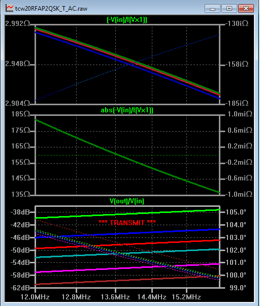 La figure 2 ci-dessus montre les 3 premiers éléments du module soumis à LTSPICE. Pour simplifier le schéma, le commutateur a été réduit à la commutation de l’antenne. Le transistor de commande 2N3906 et la clef sont simplement figurés par la source de tension continue V3, ligne appelée TxLine figure 2.