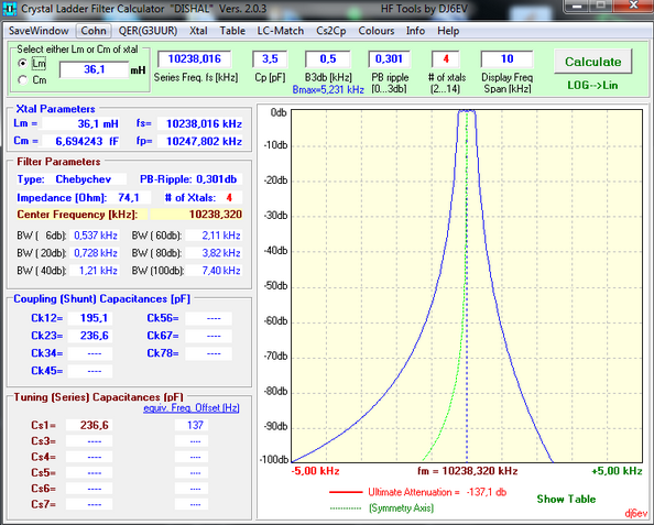 La conception des filtres est devenue aisée avec les outils de calcul développés pour nos ordinateurs personnels. Plusieurs outils gratuits sont disponibles, à ma connaissance : AADE Filter Design, Ladpac + GPLA, DISHAL de DJ6EV. Il existe aussi des calculateurs sur le web comme Crystal ladder filters de Giangrandi. Après essais, j’ai retenu DISHAL.