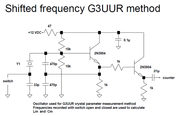 Le web fournit une documentation abondante et excellente sur le sujet. Je vous invite préalablement à la lire. J’en retiens l’excellente étude comparative et synthèse de Nick Kennedy, WA5BDU « Crystal characterization and crystal filter design An overview of tools and techniques Nick Kennedy, WA5BDU Joplin, MO April 26, 2008 » et la méthode de David Gordon-Smith, G3UUR, popularisée par Wes Hayward, W7ZOI, décrite dans le document du Dr Andrew Smith, G4OEP « Deriving G3UUR’s Equation for Motional Capacitance of a Crystal » et le document de Jack R. Smith K8ZOA « Crystal Motional Parameters A Comparison of Measurement Approaches Jack R. Smith K8ZOA 11 June 2006 » . C’est cette dernière méthode que j’ai appliquée pour la réalisation de mon filtre et le document de Jack R. Smith K8ZOA. Le principe de la méthode reste simple. Le quartz est inséré dans un oscillateur Colpitts en série avec un condensateur de 30pF. On relève la fréquence de sortie. Puis on shunte le condensateur et on relève la nouvelle fréquence. L’application des formules simplificatrices permet de trouver les valeurs de Cm et Lm avec une bonne précision.
