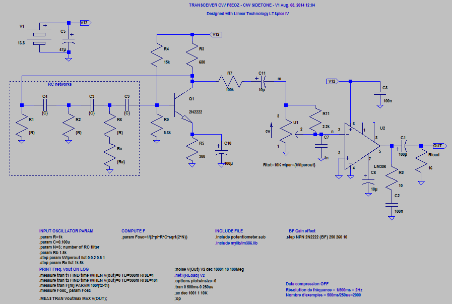 Je pensais régler ce petit circuit en quelques heures. Comme d’habitude, j’ai commencé par collationner les schémas extraits d’internet. Méthodiquement, j’ai simulé chaque type de circuit avec LTSPICE en l’adaptant à mes composants. Certains ne passent pas la simulation LTSPICE. Ceux qui passent le test sont ensuite montés sur la protoboard. Les résultats sont étonnants. En réalité l’oscillateur s’avère capricieux. Le démarrage de l’oscillation difficile. Toutes les combinaisons RC ne fonctionnent pas. J’ai donc repris entièrement la conception du circuit pour l’adapter à mon cas.