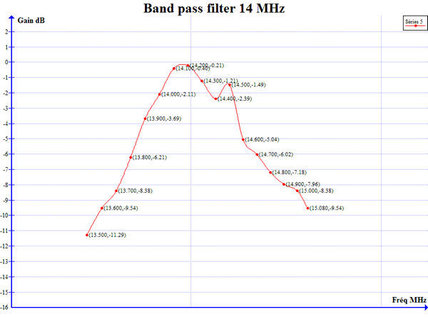 Le graphique a été tracé avec l’open source GRAPH qui permet de tracer rapidement un graphique à partir d’une série de points relevés et enregistrés dans un fichier csv. Les points ont été relevés tous les 0.100 MHz de 13,500 MHz à 15,100 MHz et la fréquence mesurée avec mon fréquencemètre. Le tracé de la courbe est obtenu par interpolation spline cubique. Cela est effectué simplement dans le menu Editer une série de points, en sélectionnant dans l’onglet Marqueurs, l’interpolation Splines cubiques. La courbe obtenue montre que la bande passante à -3db se situe de 13,950 MHz à 14,550 soit une largeur de bande de 0,600 MHz. L’atténuation minimum se situe autour de 14,220 MHz.