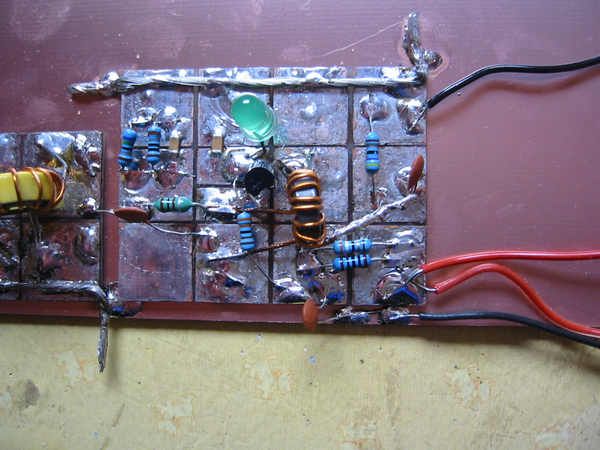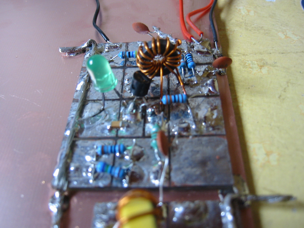 Le circuit est réalisé sur une plaque d’époxy cuivrée simple face de 5 x 3,8 cm. La gravure est simple: 4 x 3 = 12 îlots identiques. Un îlot a été découpé en 2 parties pour le transistor. Cette plaque est soudée au moyen du fil de masse sur la plaque d’époxy cuivrée qui sert de support à toutes les cartes et reliée par un condensateur de 100 nF au filtre passe bande. La photo 1 montre le circuit. Pour obtenir la valeur désirée, certaines résistances sont obtenues en soudant 2 résistances en parallèle. Les condensateurs de découplage de 100 nF sont des CMS 1206. Ces composants minuscules se soudent très facilement en utilisant la technique décrite par Francis THOBOIS. La photo 2 montre comment l’inductance L1 est enroulée sur le tore.