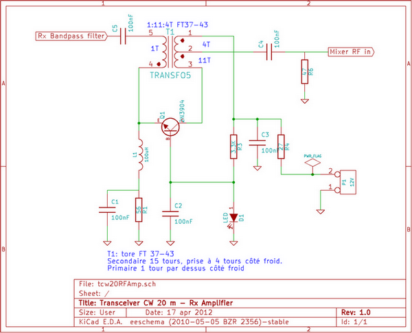 J’ai repris le schéma de K8IQY. La base du transistor est polarisée avec une LED 2V, 2mA. J’ai simplement remplacé le transistor 2N2222 par le 2N3904 et ajouté un condensateur de liaison C5 = 100 nF entre le filtre passe bande et l’amplificateur. Le tore utilisé est un FT37-43 acheté chez Kits and Parts . Le bobinage 1:11:4 pour obtenir un gain de 12dB dans la bande 14MHz, a été réalisé avec du fil de cuivre émaillé de 0.7 mm récupéré sur un ancien téléviseur. Mini tore calculateur , indique l’inductance pour chaque bobine : 300 nH : 36.3 uH : 4,8 uH. Le bobinage, côté collecteur du transistor est fait de 15 tours de fil avec une prise à 4 tours côté froid. Côté émetteur du transistor, le bobinage est fait d’un fil passé dans le tore côté froid (attention à la phase, voir photo plus bas au paragraphe réalisation).
