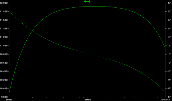 outmax: MAX(mag(v(out)))=(11.9227dB,0°) FROM 1e+006 TO 1e+008