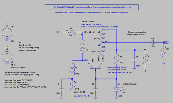On constate sur le premier graphe la parfaite amplification du signal. Sur le second graphe on note que la courbe de réponse est plate dans la partie des 14 Mhz et sur une très large bande. Le gain à 14 MHz = 11,92 dB est approximativement le gain maximum sur la plage 1 à 100 MHz et correspond au gain théorique prévu de 12 dB avec le transformateur 1:11:4.