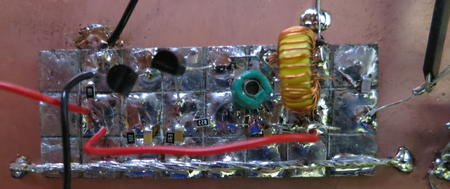 Le circuit ainsi gravé est fin et précis. Il est bien adapté aux composants CMS ou SMD 0805 et 1206 que j’utilise maintenant presque exclusivement. Le condensateur C4 est un petit trimmer céramique. Ces composants sont tous achetés sur Ebay qui offre dans ce domaine, un vaste choix (voir fournisseurs en marge) . L’étamage du cuivre permet de souder facilement ces petits composants. J’utilise pour les souder, un fer Weller WSP80 muni de la panne standard de 2mm. Le transformateur de sortie, calculée avec mini ring core calculator de DL5SWB est fait de 45 tours pour le primaire et de 9 tours pour le secondaire bobinés sur le primaire dans le même sens, de fil de Cu émaillé de 0,3 mm récupéré sur un ancien BCL. Les spires doivent être réparties sur tout le tore.