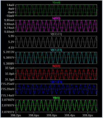 V(vcc): 13.8 voltage V(c2): 12.7289 voltage V(b2): 8.26864 voltage V(c1): 7.55348 voltage V(b): 12.768 voltage V(e1): 2.16377 voltage V(b1): 2.87897 voltage Ic(Q1): 0.00980336 device_current Ib(Q1): 3.19496e-005 device_current Ie(Q1): -0.00983531 device_current Ic(Q2): 0.00977145 device_current Ib(Q2): 3.191e-005 device_current Ie(Q2): -0.00980336 device_current I(R1): 0.000546051 device_current I(R2): 0.000514102 device_current I(Re): 0.00983531 device_current I(R3): 0.0005487 device_current I(R4): 0.00051679 device_current I(R5): 0.0103202 device_current I(Rgain): 0.000514102 device_current