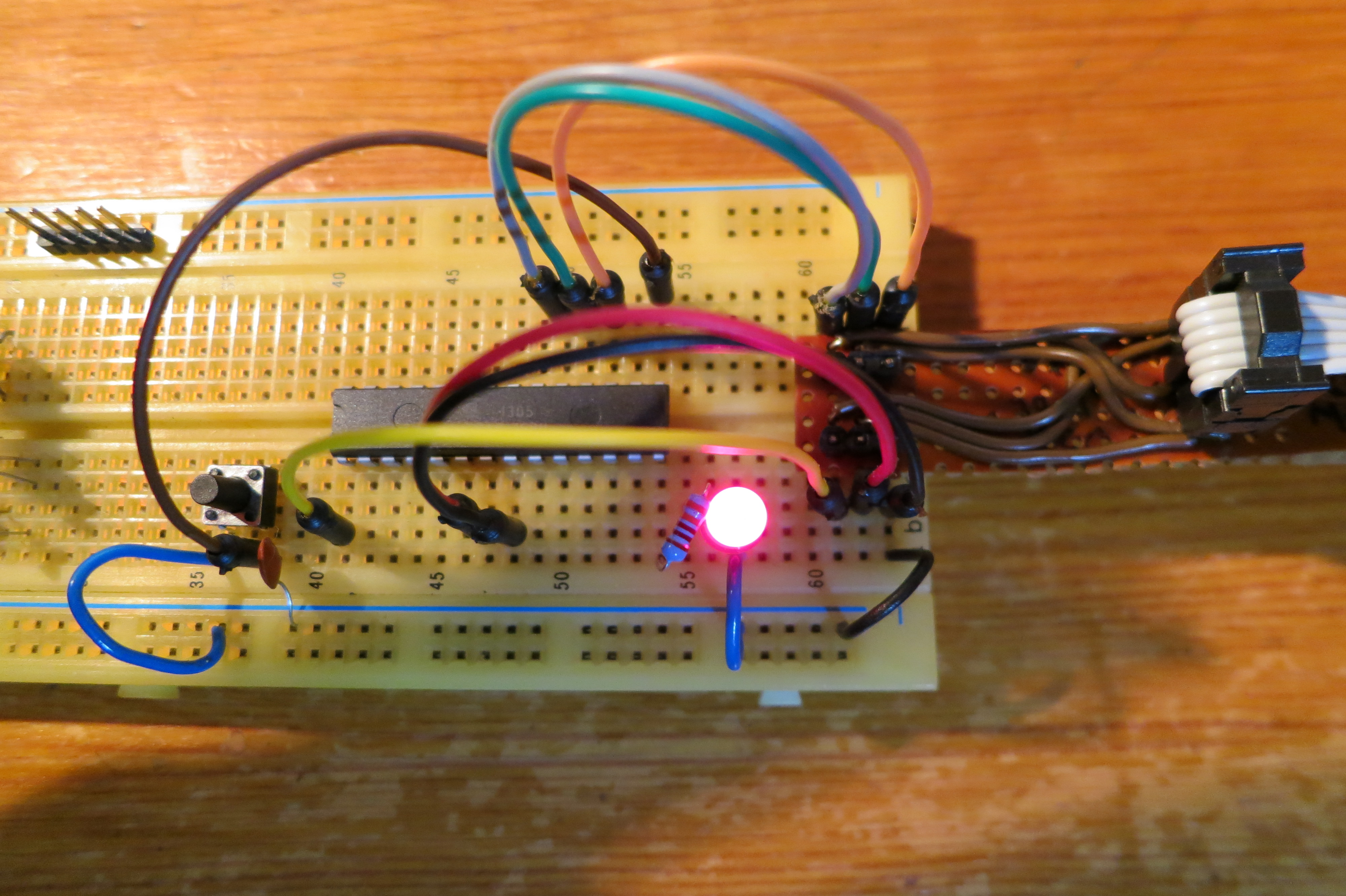 Pour avoir une connexion solide du connecteur ISP à la plaque d’essai, j’ai réalisé un petit adaptateur avec une chute de plaque veroboard et 4 morceaux de 3 pins de barrette sécable, 2 x 3 pins qui s’enfichent sur la prise ISP, 2 x3 pins qui s’enfichent sur la plaque d’essai, photo 5 ci-dessous.