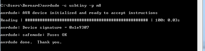 La photo 4 ci-dessous montre le message qu’il faut obtenir. Cela indique que la connexion est bien établie mais que le dispositif, ici m8, pour ATMEGA8 n’est pas connecté. Normal puisqu’ aucun microcontrôleur à programmer n’est connecté à la ligne ISP. Bien entendu si vous compter utiliser un autre microcontrôleur, changer simplement le paramètre de l’option -p. La liste des dispositifs est donnée dans la documentation de avrdude. Mais le message obtenu sera le même.