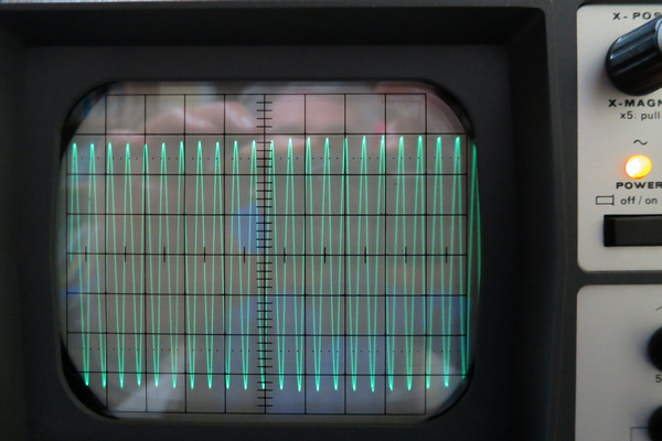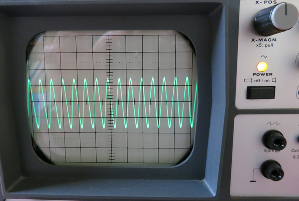 Avec l’oscilloscope, échelle Y=0,1 V/cm, sonde atténuatrice 1:1, échelle X=0.5 us/cm, loupe x5, la photo 3 ci-dessous, montre le signal en sortie Vout ≈ 560 mV pp.