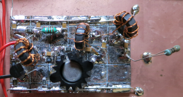 Le circuit est réalisé sur une plaque d’époxy cuivrée simple face de 5 x 3,8 cm. La gravure est simple: 4 x 3 = 12 îlots identiques. Un îlot a été découpé en 2 parties pour le transistor. Cette plaque est soudée au moyen du fil de masse sur la plaque d’époxy cuivrée qui sert de support à toutes les cartes et reliée par un condensateur de 100 nF au filtre passe bande. La photo 1 montre le circuit.  Pour obtenir la valeur désirée, certaines résistances sont obtenues en soudant 2 résistances en parallèle. Les condensateurs de découplage de 100 nF sont des CMS 1206. Ces composants minuscules se soudent très facilement en utilisant la technique décrite par Francis THOBOIS. La photo 2 montre comment l’inductance L1 est enroulée sur le tore.