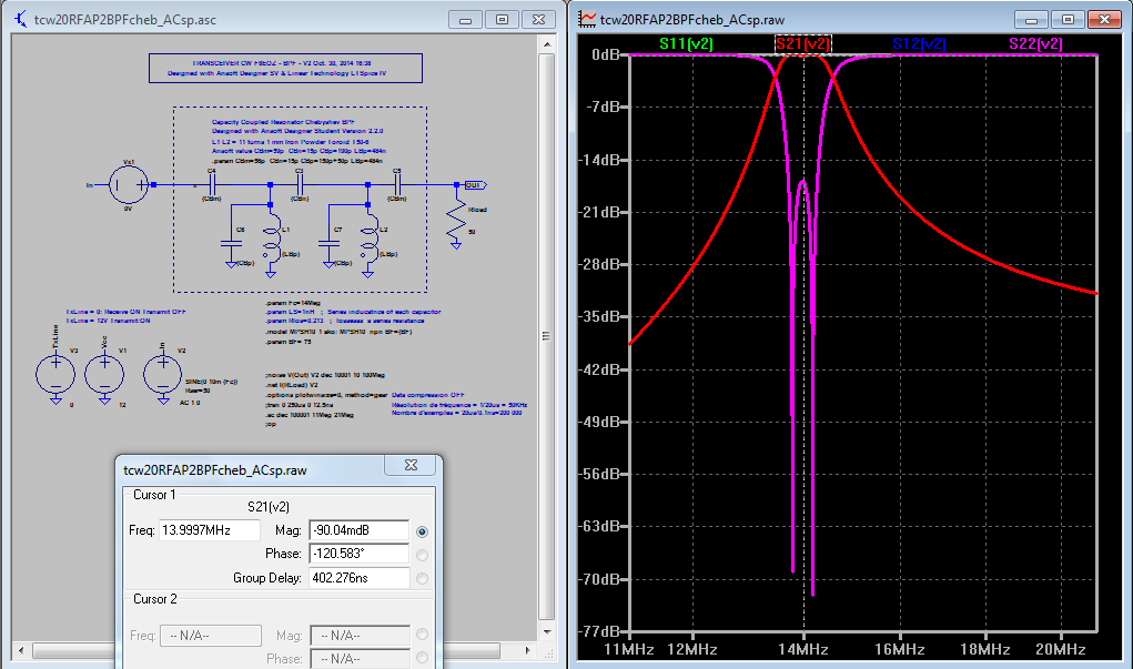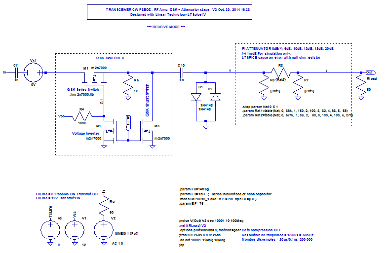 Le circuit complet du module RF, figure 14, est présenté en mode réception. Le générateur en entrée produit une tension crête de 10mV @50Ω, figurant ainsi un signal de 1uW @14MHz soit -30dBm sur l’antenne. En radio, sur 50 Ohms, dBm = 10*log(P) avec P en milliwatt. Où P = 0.010V*0.010V*1000/(2*50Ω), il vient 10*log(0.001)=-30dBm. Cela peut être calculé simplement avec mini dB calculator de DL5SWB (silent key). En sortie nous obtenons un signal de 25mV crête @50Ω soit 6.3uW.