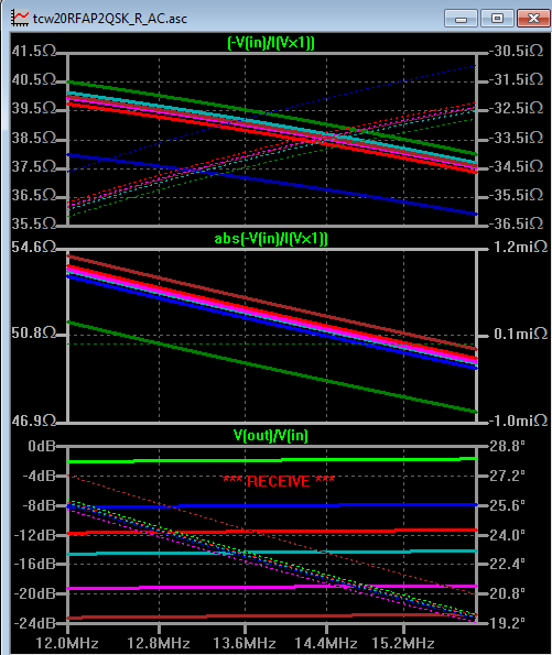 La figure 15, montre le circuit en mode émission. Comme le montre le graphe, le circuit n’est pas étanche à la HF. Pour ce faire je simule l’application d’un signal de 5.8W@14MHz soit une tension crête de 24V @50Ω.