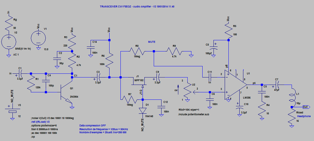 Je réunis dans un même article la description de l’oscillateur et du mélangeur de l’émetteur. L’oscillateur génère le signal de fréquence fixe F = 10,240 MHz de l’émetteur. Le mélangeur reçoit ce signal et celui du VFO pour produire un signal dans la bande de fréquence F = [14 ; 14,350] MHz qui sera ensuite amplifié et dirigé vers l’antenne. Lire la suite…