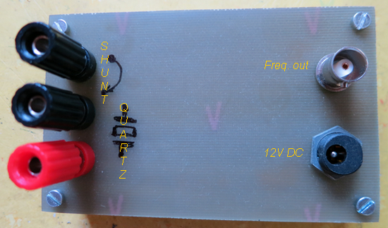 J’ai construit l’oscillateur décrit à la page 15 du document de WA5BDU et à la page 4 du document de K8ZOA, extrait et photos 1 et 2 ci-dessous. Pour la mesure, le quartz est fixé solidement sur les 2 bornes à visser rouge et noire. Pour la mesure nécessitant le shunt du condensateur de 30pF en série avec le quartz, un gros fil est ajouté et fixé solidement sur les 2 bornes à visser noires (évitez l’interrupteur). Le circuit est alimenté par une alimentation de 13,8V. La sortie est connectée au fréquencemètre. Le circuit imprimé est soudé sur une carte mère en époxy portant les connecteurs, elle-même vissée sur 2 cornières en aluminium coupées à dimension, donnant à l’ensemble une grande rigidité.