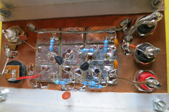 J’ai utilisé pour ce circuit des composants CMS ou SMD 0805 NP0 +- 10% 180pF et 220pF achetés sur Ebay que la finesse du tracé me permet de placer entre chaque îlot. Le circuit s’en trouve très allégé. L’étamage du cuivre permet de souder facilement ces petits composants. J’utilise pour les souder, un fer Weller WSP80 muni de la panne standard de 2mm. Le boîtier des quartz est soudé à la masse.