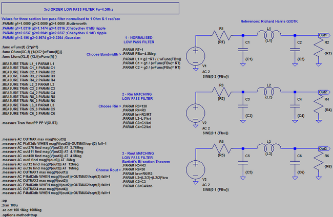 Values for three section low pass filter normalised to 1 Ohm & 1 rad/sec .PARAM g1=1.0000 g2=2.0000 g3=1.0000 ;Butterworth .PARAM g1=1.0316 g2=1.1474 g3=1.0316 ;Chebychev 01dB ripple .PARAM g1=2.0237 g2=0.9941 g3=2.0237 ;Chebychev 0.1dB ripple .PARAM g1=2.196 g2=0.9674 g3=0.3364 ;Gaussian