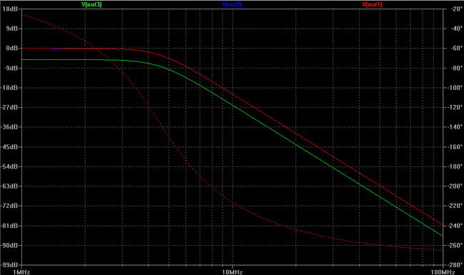 outmax1: MAX(mag(v(out1)))=(-0.00507865dB,0°) FROM 1e+006 TO 1e+008 f1fall3db: mag(v(out1))=outmax1/sqrt(2) AT 4.50025e+006 outmax2: MAX(mag(v(out2)))=(-0.00055803dB,0°) FROM 1e+006 TO 1e+008 f2fall3db: mag(v(out2))=outmax2/sqrt(2) AT 4.50018e+006 outmax3: MAX(mag(v(out3)))=(-5.10602dB,0°) FROM 1e+006 TO 1e+008 f3fall3db: mag(v(out3))=outmax3/sqrt(2) AT 4.50018e+006 out376: mag(v(out3))=(-6.37754dB,0°) at 3.76e+006 out411: mag(v(out3))=(-7.09339dB,0°) at 4.11e+006 out450: mag(v(out3))=(-8.1158dB,0°) at 4.5e+006 out8: mag(v(out3))=(-20.2335dB,0°) at 8e+006 out12: mag(v(out3))=(-30.675dB,0°) at 1.2e+007 out16: mag(v(out3))=(-38.162dB,0°) at 1.6e+007