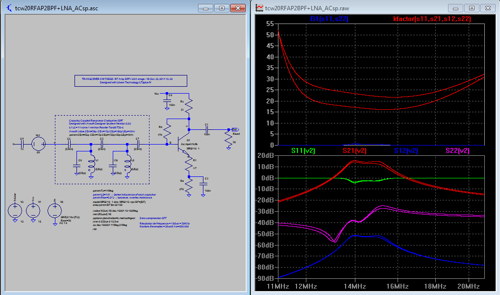 La figure 2 ci-dessus montre les 3 premiers éléments du module soumis à LTSPICE. Pour simplifier le schéma, le commutateur a été réduit à la commutation de l’antenne. Le transistor de commande 2N3906 et la clef sont simplement figurés par la source de tension continue V3, ligne appelée TxLine figure 2.