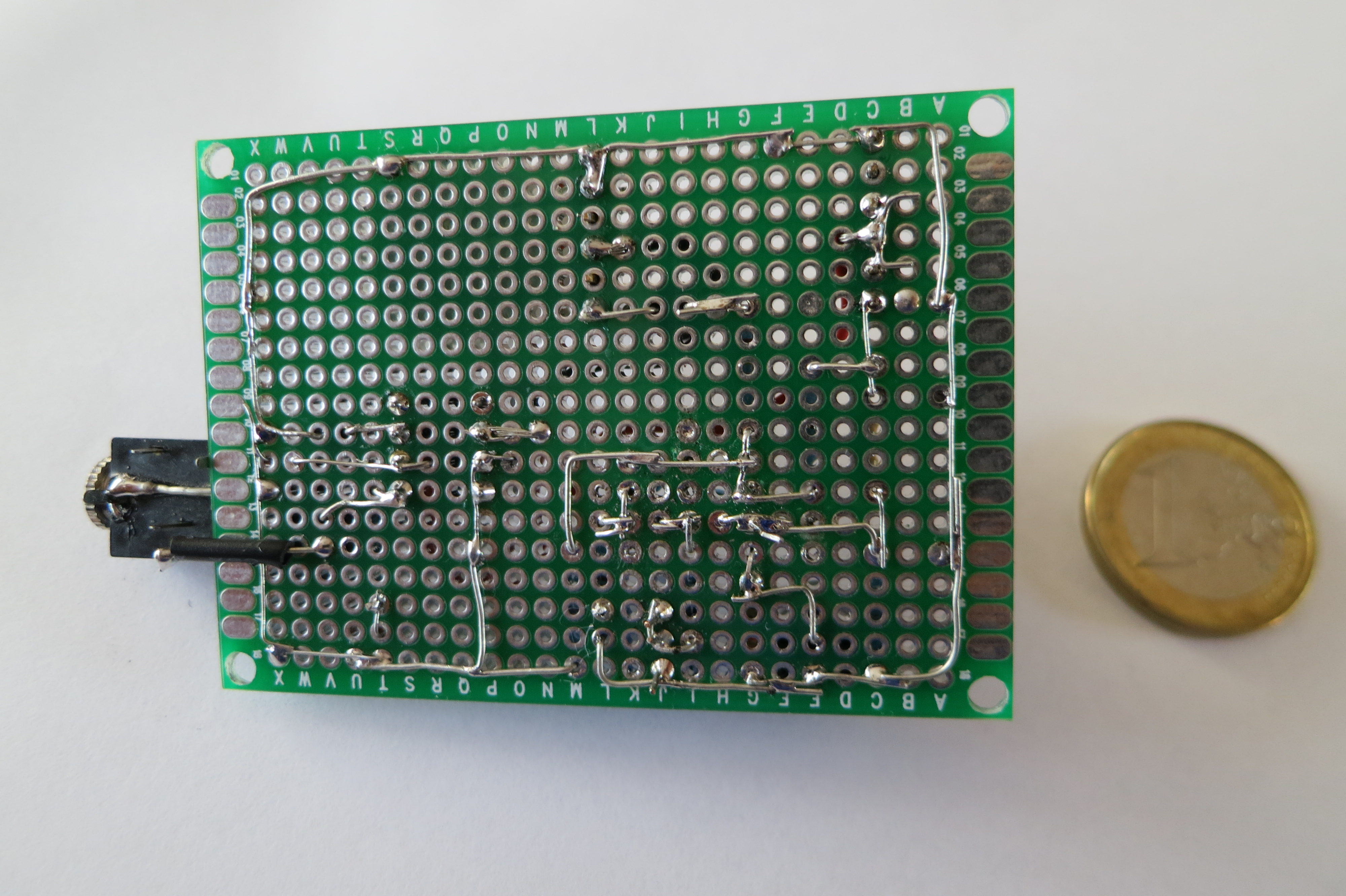 Le circuit est câblé sur une plaquette PCB FR4 pastillée étamée à trous métallisés double face de 5x7x0,16 cm ( figure 1 et figure 7).